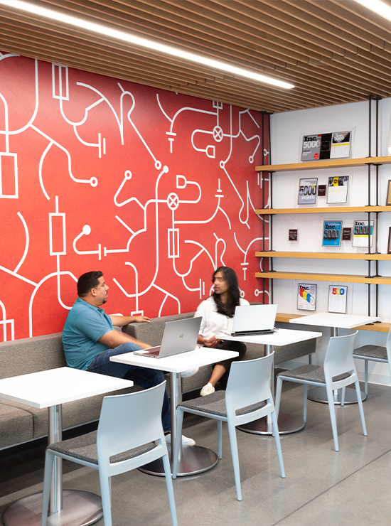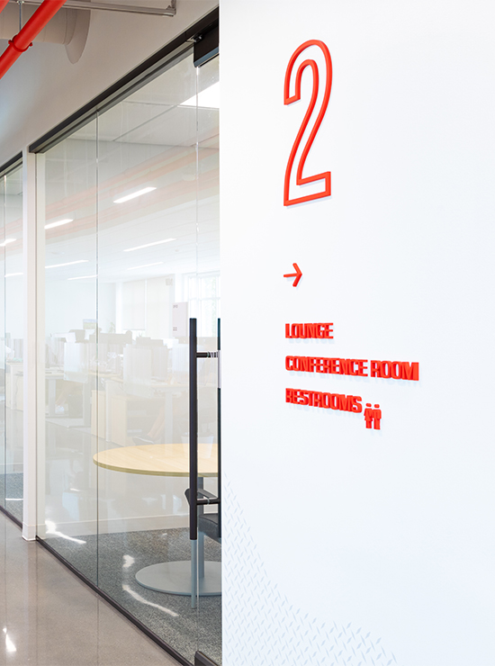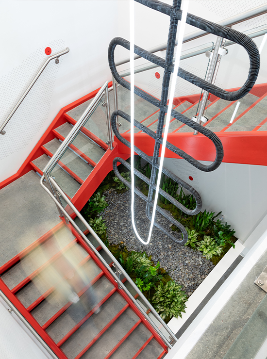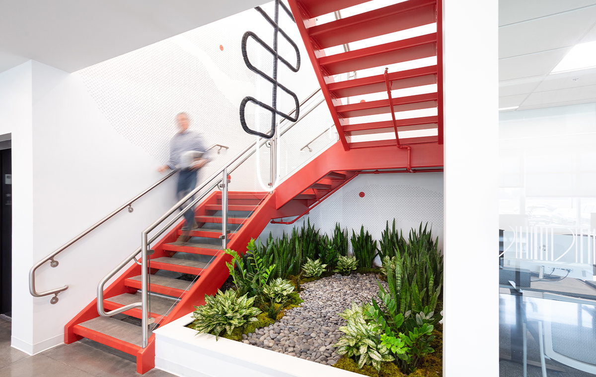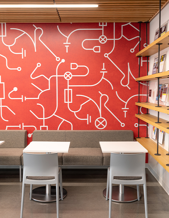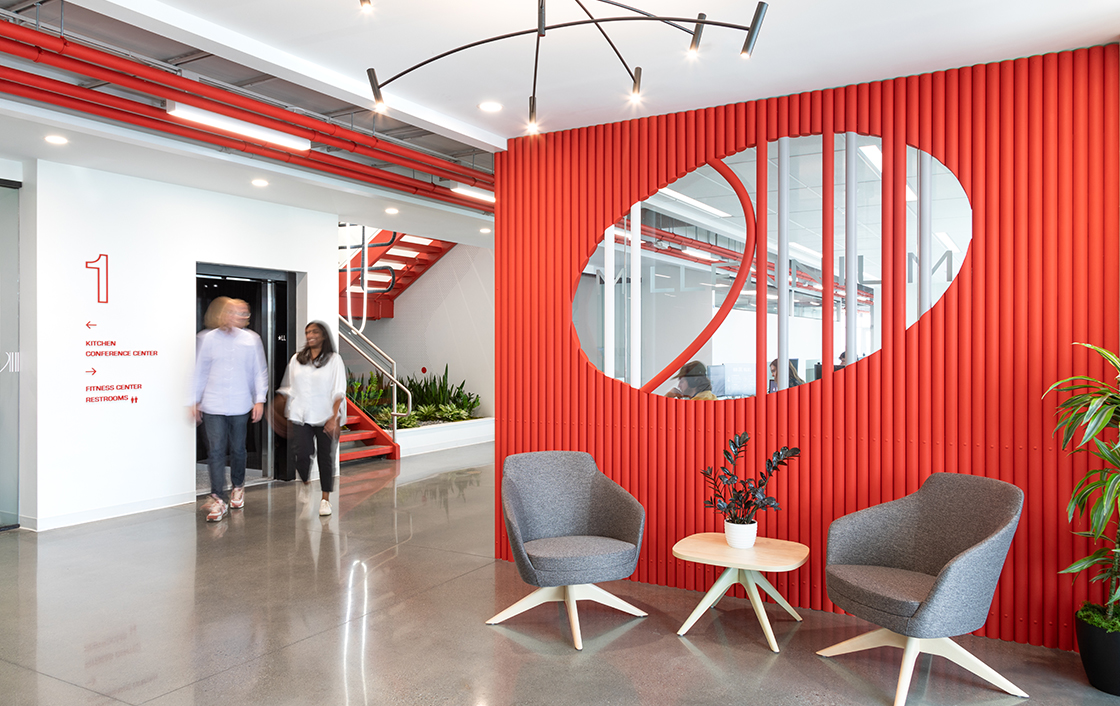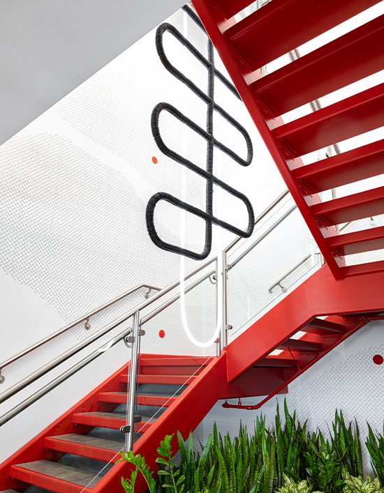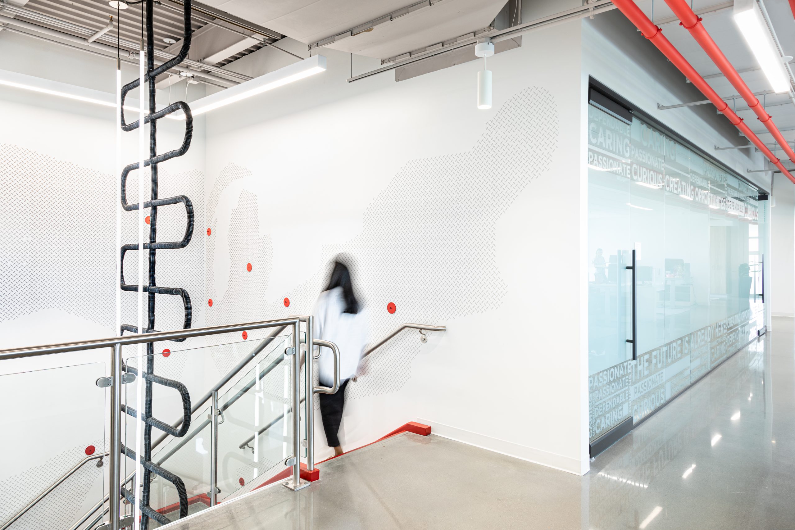 Our solution was to create a visually striking and effective design layers that enhances brand visibility, improve employee experience, and ensures consistent communication across all locations. From clear brand messaging at the office's entry to physical use of their product as architectural elements, the experience becomes clearly personal to the brand. The use of red is used to activate certain experiential spaces and lead people from use side of the building to the other. The use of their products as architectural elements further strengthens our mission to demonstrate their innovation and commitment to educating everyone on their product offerings.